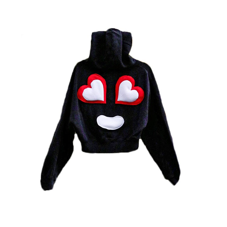 This black cropped hoodie features our signature 3D appliqué heart-face design — soft velvet-mink hearts stitched by hand for a bold, textured finish that pops.